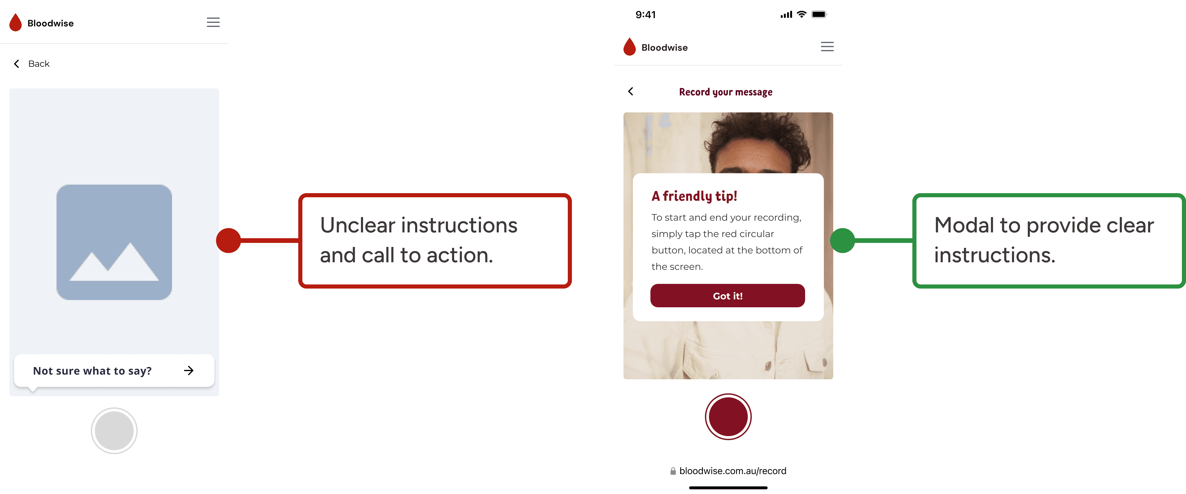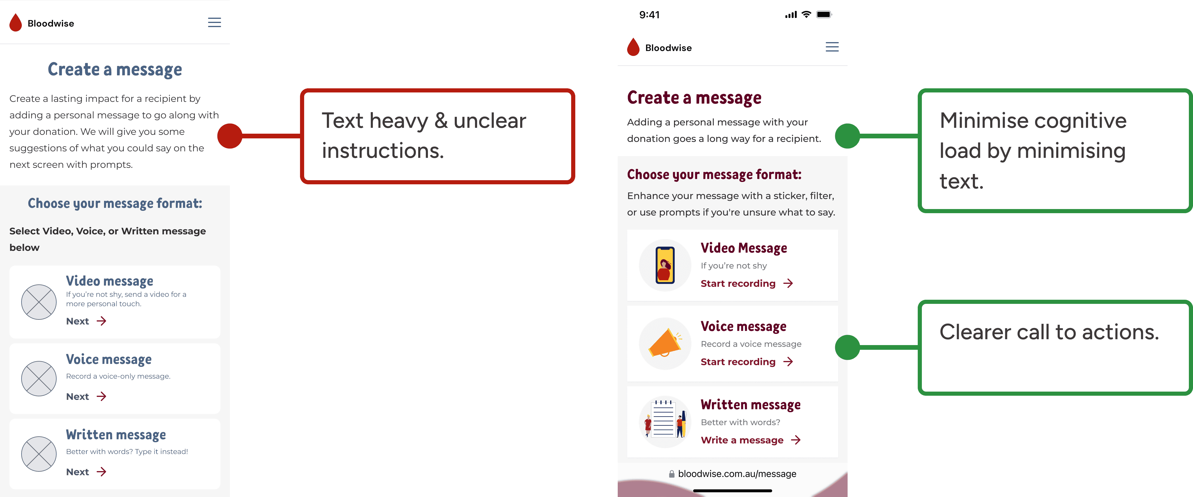 Usability tests showed the landing page was too dense and lacked clear directions. To fix this, content was condensed and headlines were made more direct. The call-to-actions for choosing a message format were also improved for clarity. Finally, since 3 out of 9 testers couldn't complete the "Record your message" section due to confusion, a modal was added to provide clear instructions.
