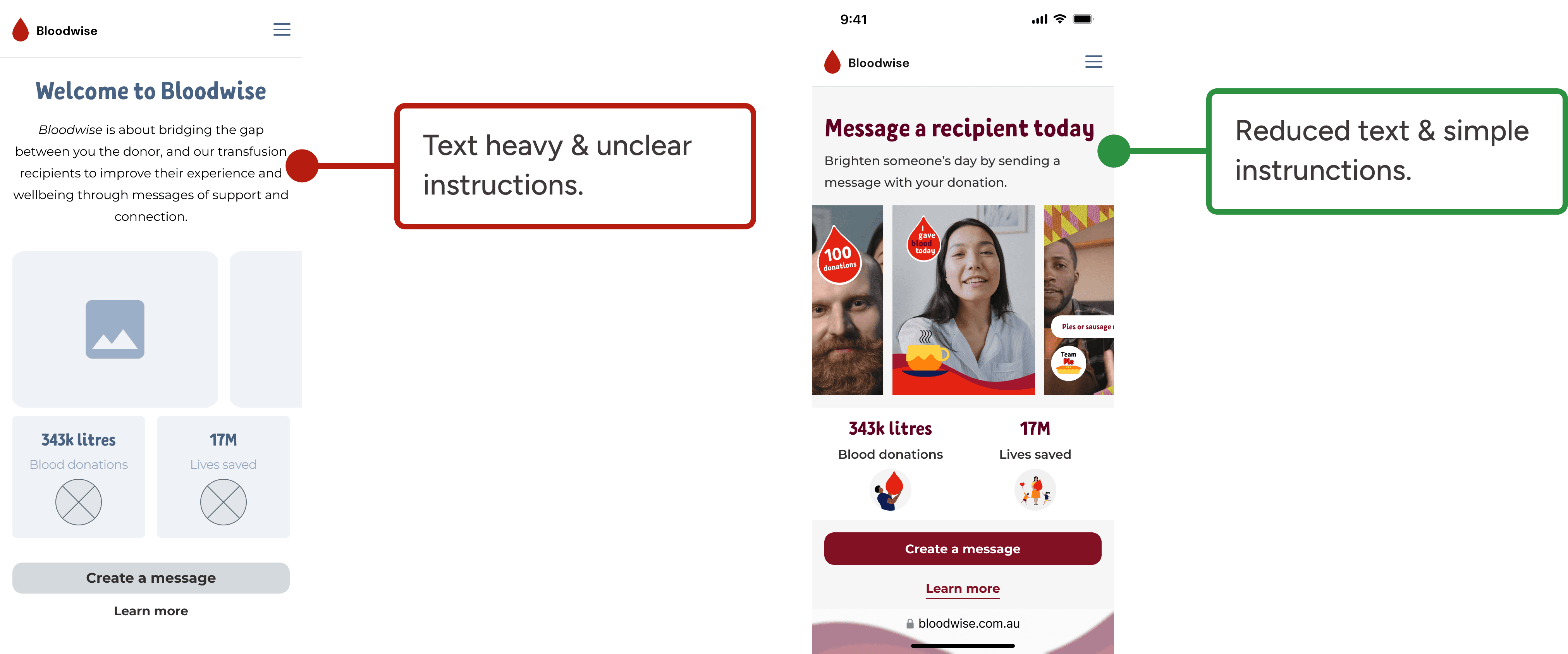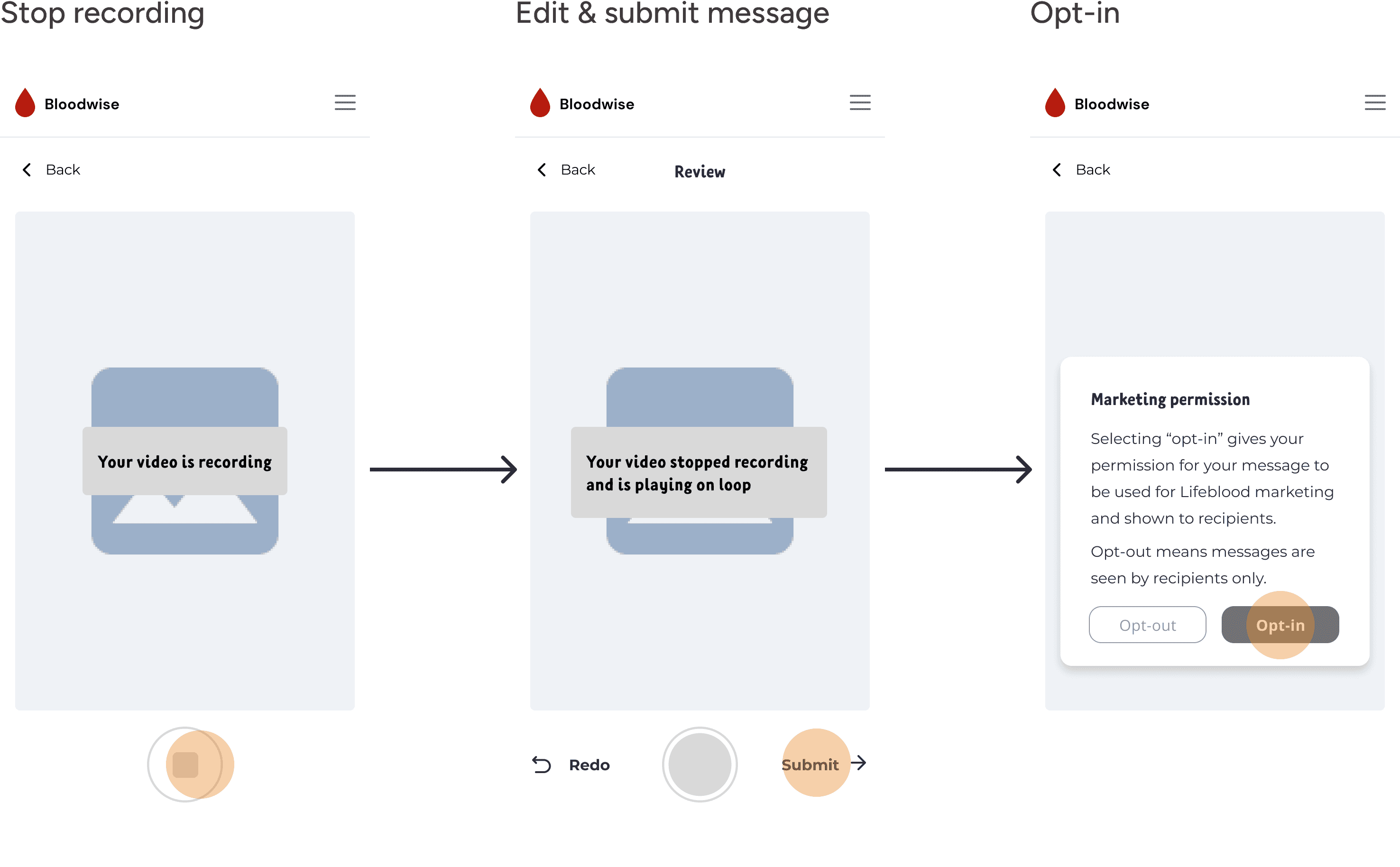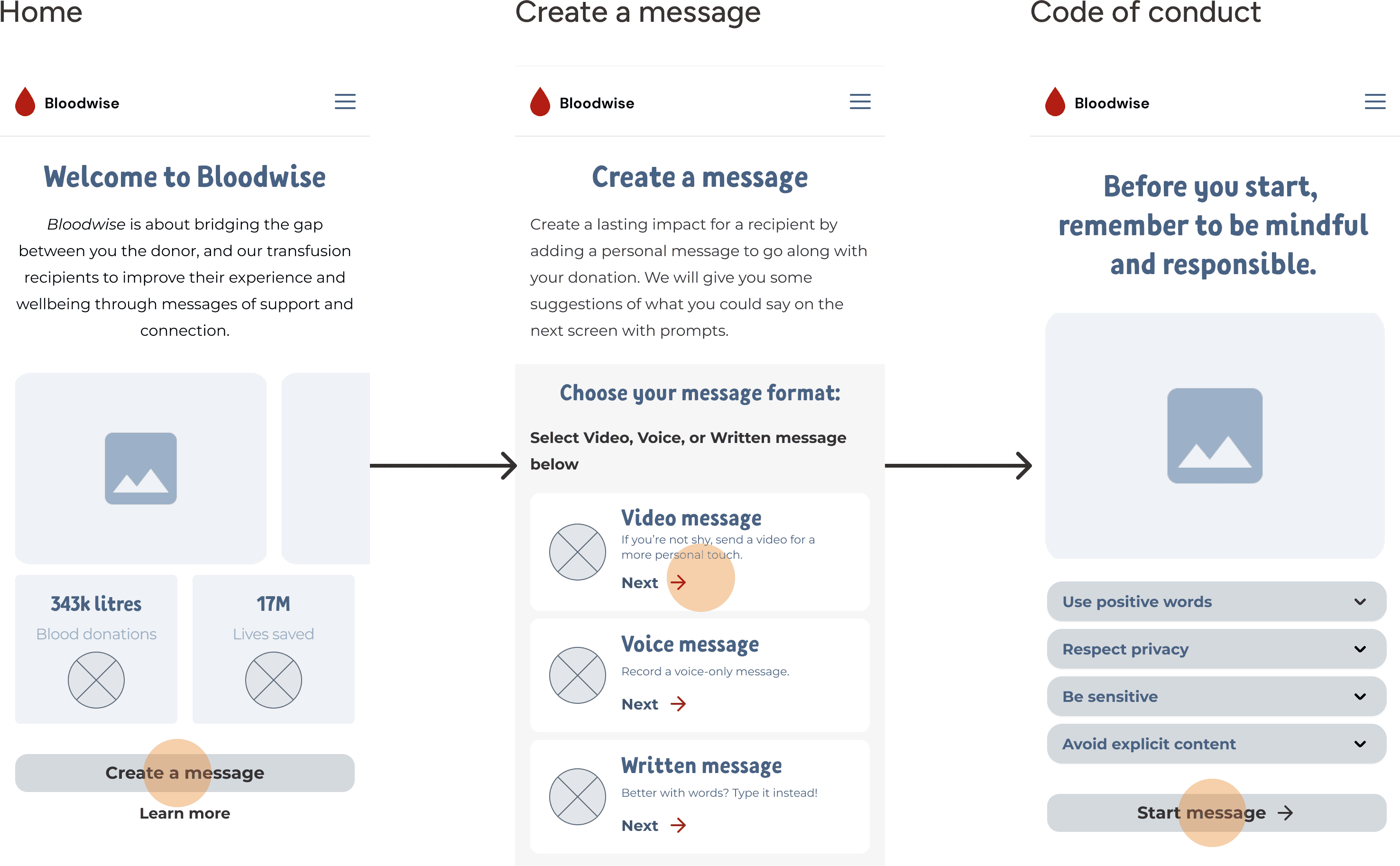 These wireframes focus on enhancing the blood donor experience by addressing key communication and engagement points: