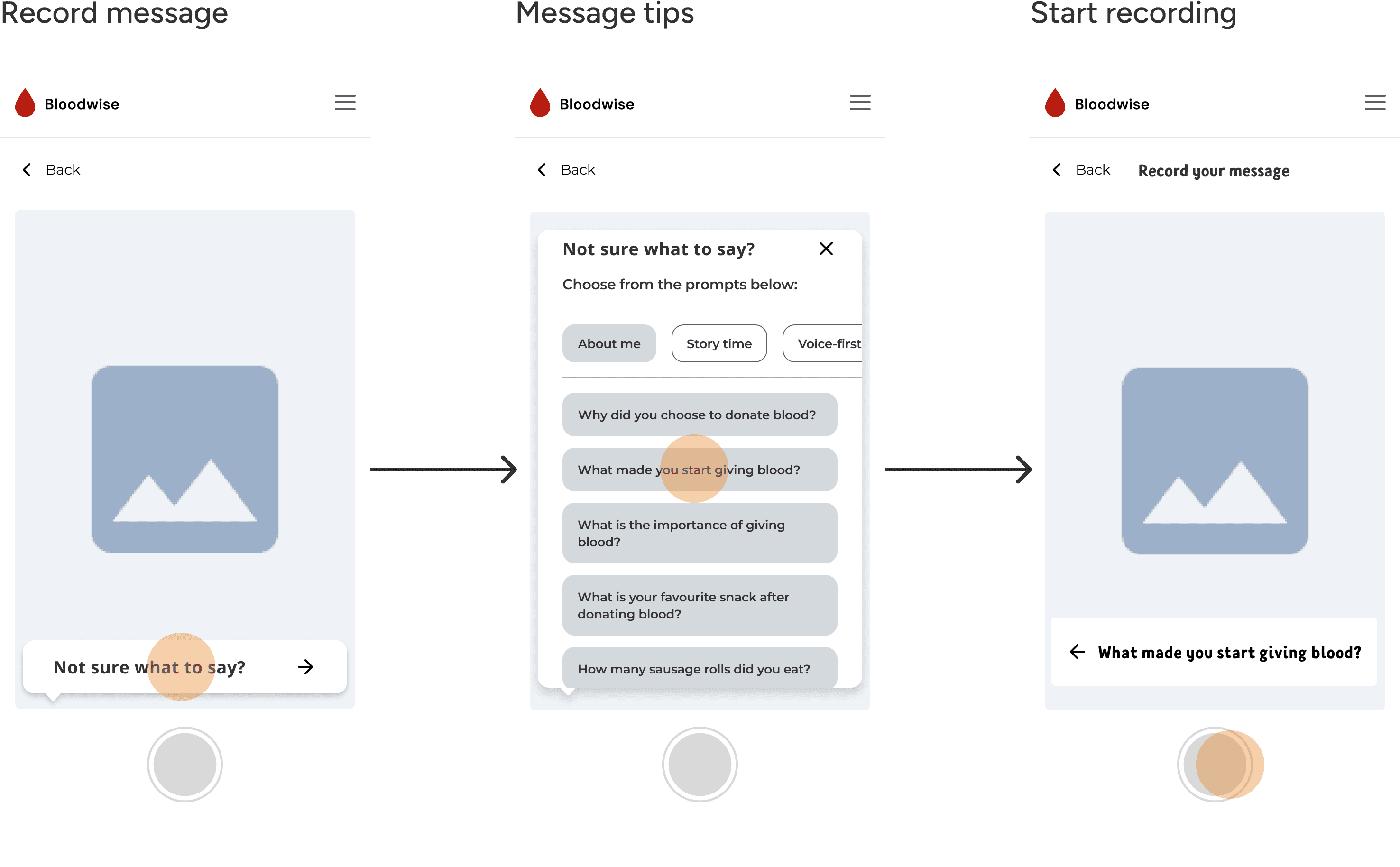 Message Assistance: To help donors, a list of prompts (from Bloodwise's trial) is available before recording messages.