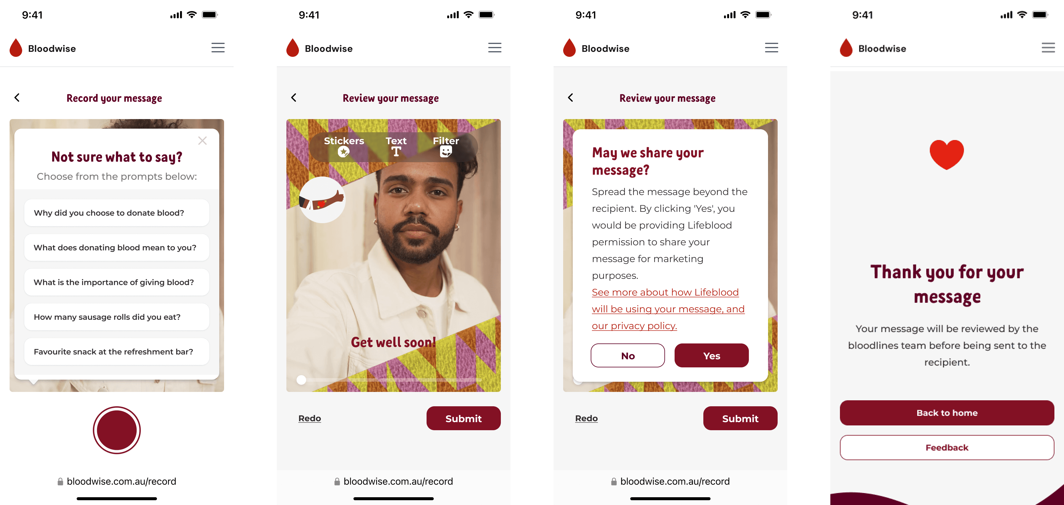 In 2018 Bloodwise conducted a proof of concept trial at their blood donation centres, where they allowed blood donors to record a video message that would be sent to recipients. Their trial uncovered that recipients do not have the same experience, for them blood transfusions are a clinical process, a sterile bag hanging in a hospital room. Additionally, they have found that these video messages minimises the feeling of isolation and improves the well being of the recipients. Bloodwise would like to take the trial further and develop a bridge that closes the gap between blood donors and recipients by giving blood donors a platform to be able to send messages to recipients.